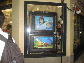 | 大須商店街の「大須観音」側入り口。なんとなく怪しげ。 | あるおもちゃやの店頭 何故か2つモニターの上はあずまんがで下はクレクレタコラ |