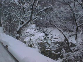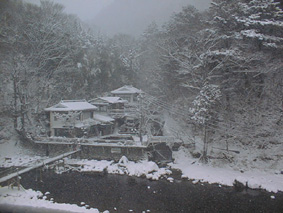 今回は「満寿屋」という宿に泊まりました。一旦着替えて外へお土産品(地酒)の買い出しに。その後、風呂に入る。雪が降っていたせいか、露天風呂は寒かったです。