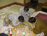 | 人生ゲームの所有者、安藤さん | ゲームに興じる面々。傍らには人形が(笑) 。 |